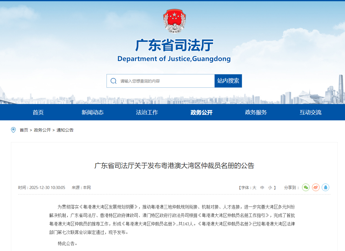 为贯彻落实《粤港澳大湾区发展规划纲要》,推动粤港澳三地仲裁规则衔接、机制对接、人才连接,进一步完善大湾区多元纠纷解决机制,广东省司法厅、香港特区政府律政司、澳门特区政府行政法务司根据共同商定并获粤港澳大湾区法律部门第六次联席会议审议通过的《粤港澳大湾区仲裁员名册工作指引》,完成了首批粤港澳大湾区仲裁员的推荐工作,形成《粤港澳大湾区仲裁员名册》共143人并于2025年12月30日同时发布。