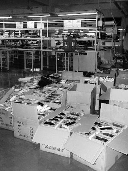 “山寨工厂”生产线的旁边堆砌着几十箱仿冒成品。
