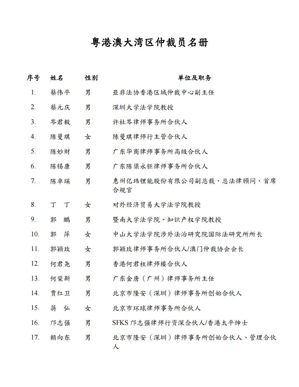 为贯彻落实《粤港澳大湾区发展规划纲要》,推动粤港澳三地仲裁规则衔接、机制对接、人才连接,进一步完善大湾区多元纠纷解决机制,广东省司法厅、香港特区政府律政司、澳门特区政府行政法务司根据共同商定并获粤港澳大湾区法律部门第六次联席会议审议通过的《粤港澳大湾区仲裁员名册工作指引》,完成了首批粤港澳大湾区仲裁员的推荐工作,形成《粤港澳大湾区仲裁员名册》共143人并于2025年12月30日同时发布。